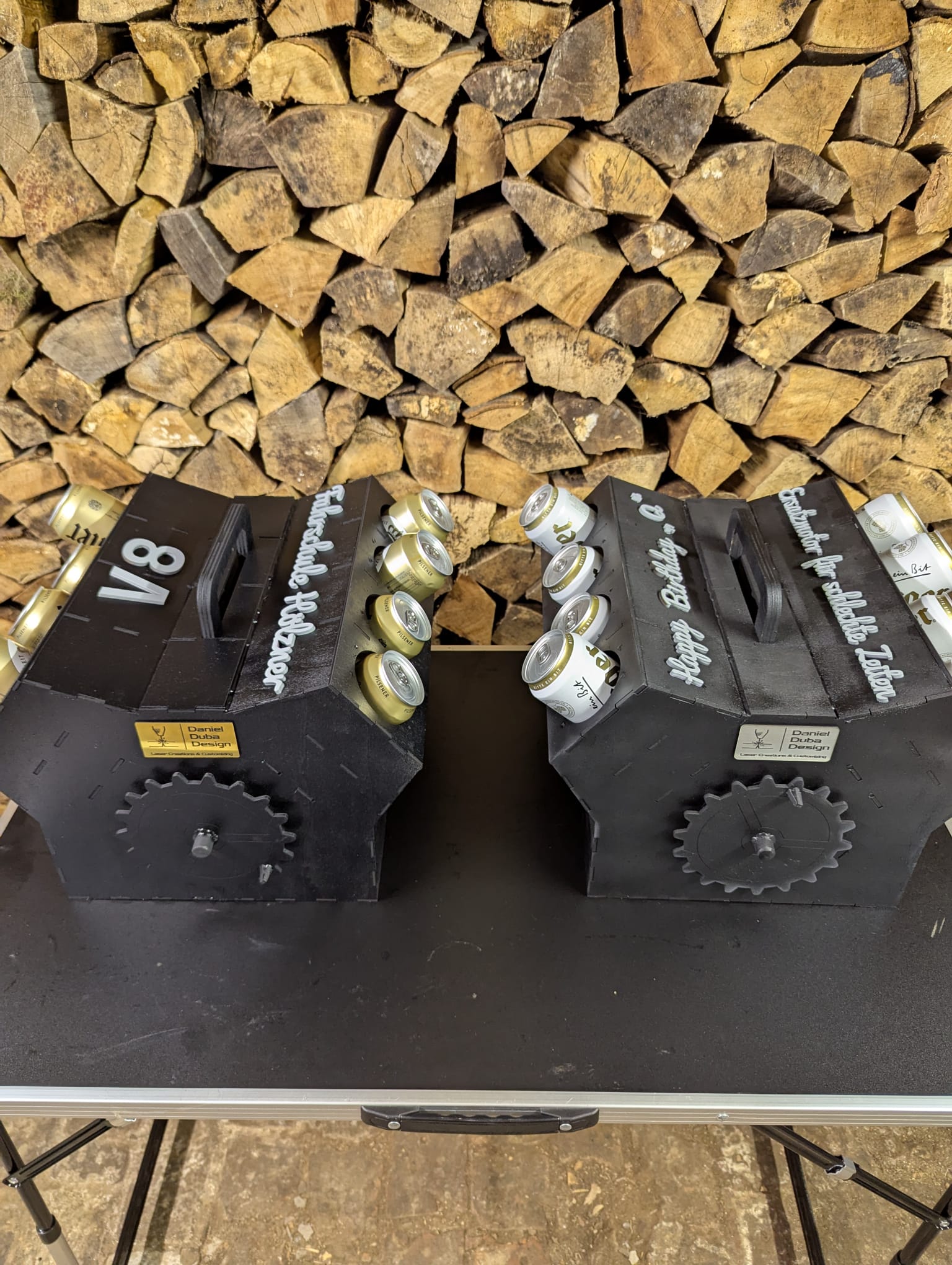Unser Biermotor ist nicht nur ein echter Hingucker, sondern auch ein praktischer Bierträger im originellen V8 Motor-Design. Das Besondere: Durch Drehen an der Kurbel bewegen sich die Flaschen oder Dosen auf und ab – genau wie Kolben in einem echten Motor. Ein Highlight auf jeder Feier!