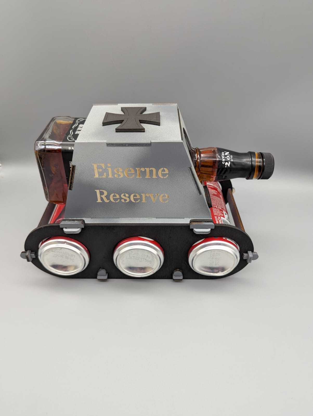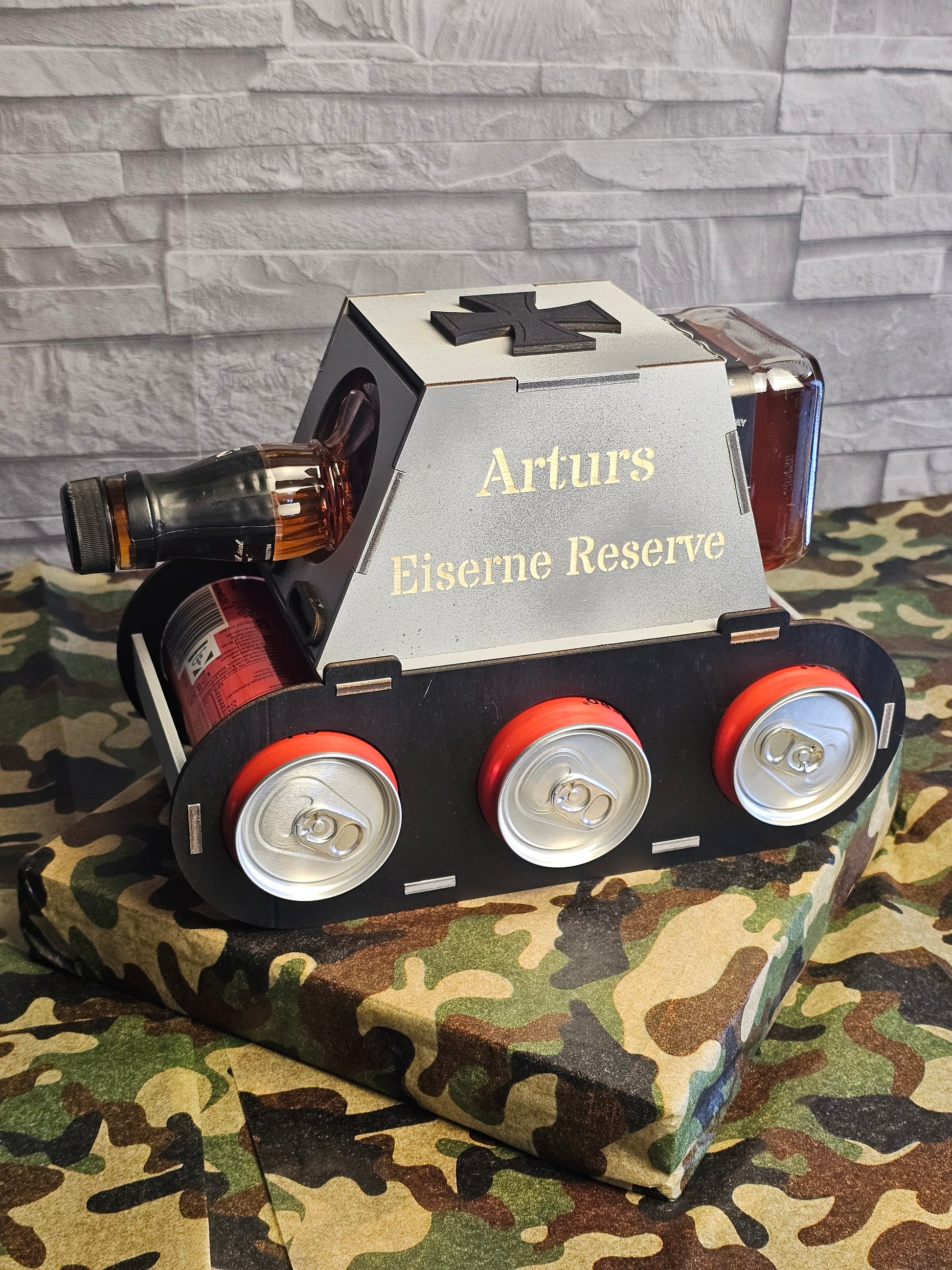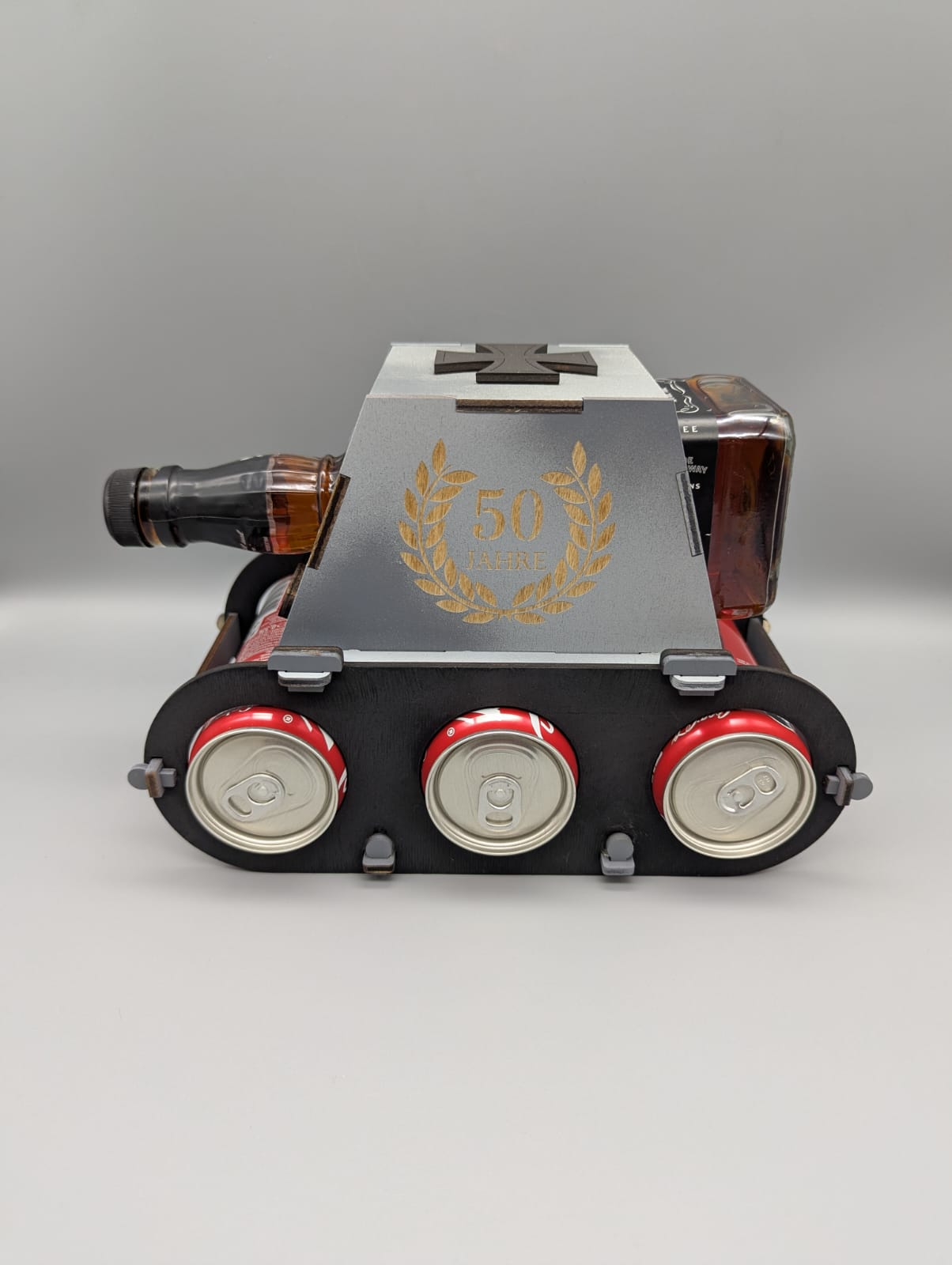Unser Jacky Panzer ist nicht nur ein echter Hingucker, sondern auch ein praktischer Flaschenhalter im originellen Panzer-Design – speziell konzipiert für eine Flasche Jack Daniel's und drei Dosen Cola. Mit frei wählbaren Lasergravuren auf beiden Seiten wird er zu einem einzigartigen und persönlichen Geschenk ❤️