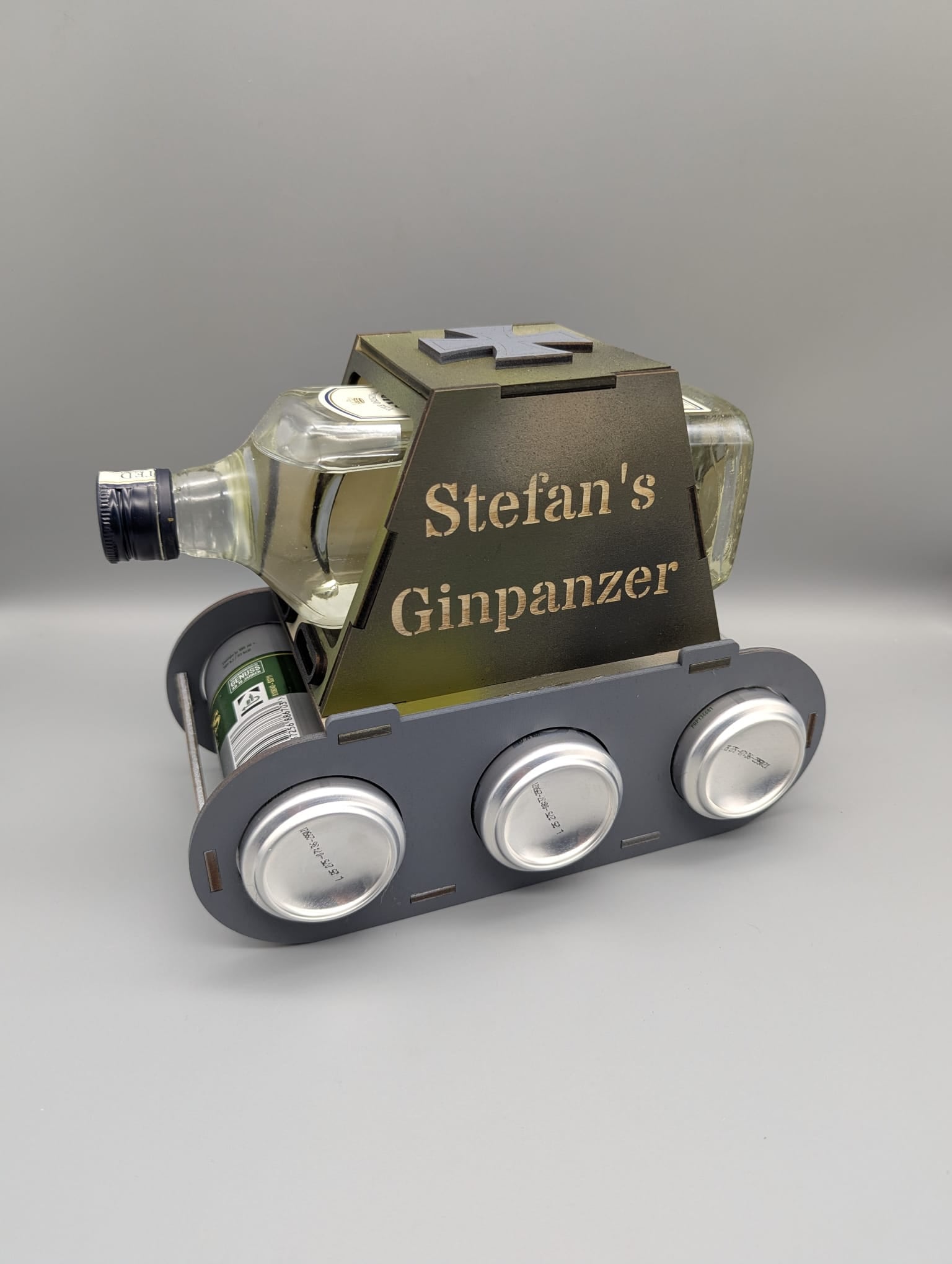 Unser Ginpanzer ist nicht nur ein echter Hingucker, sondern auch ein praktischer Flaschenhalter im originellen Panzer-Design – passend für eine Flasche Gin (z. B. Bombay Original oder Sapphire) sowie drei Dosen Tonic oder Mixer. Mit frei wählbaren Lasergravuren auf beiden Seiten wird er zu einem einzigartigen und persönlichen Geschenk ❤️